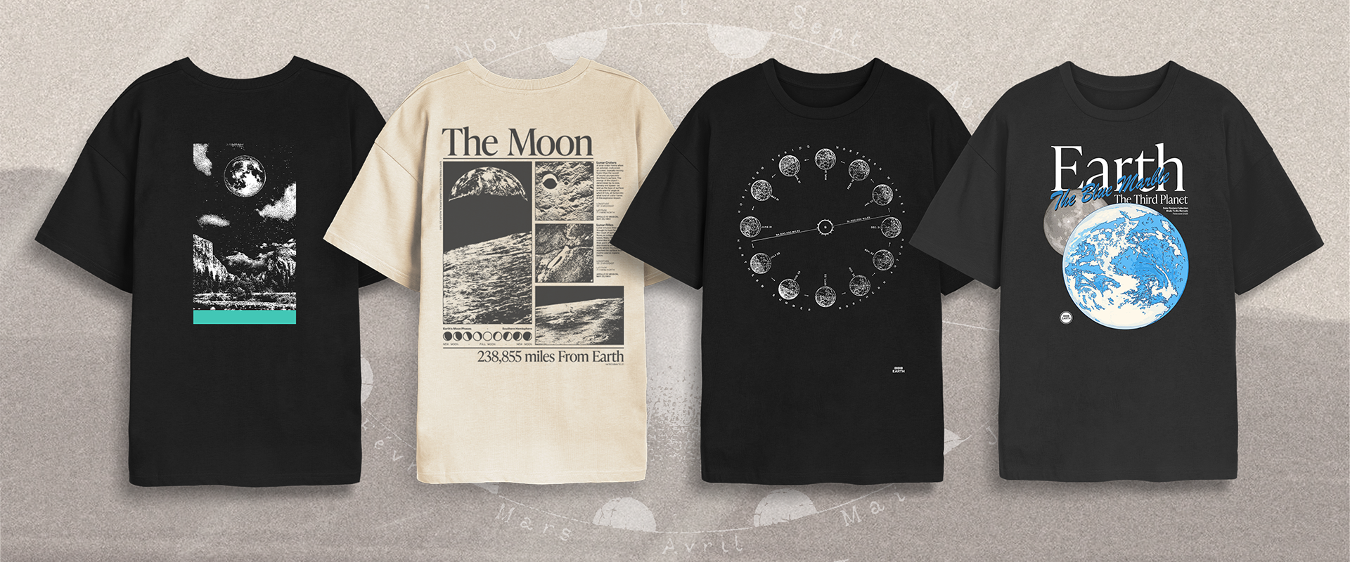 The designs followed a similar visual style to the existing designs in collection, which had released a month prior - inspired by 90s textbooks, designed using archival material from NASA's archives.